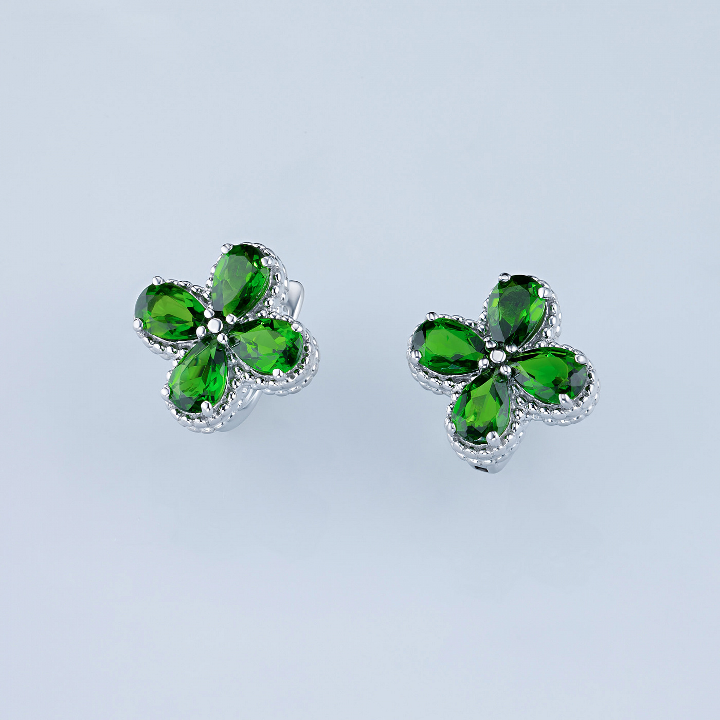 Sterling Silver Earrings with 8 Pear-Cut Chromdiopsides 3.567 CT.TW - an excellent addition to your jewelry collection. Jewelry with natural Diamonds produced at the "EPL". Silver emphasizes the play of light on facets of a diamond, not afraid of water and is suitable for everyday wear. Our goods are sold only in retail showrooms.