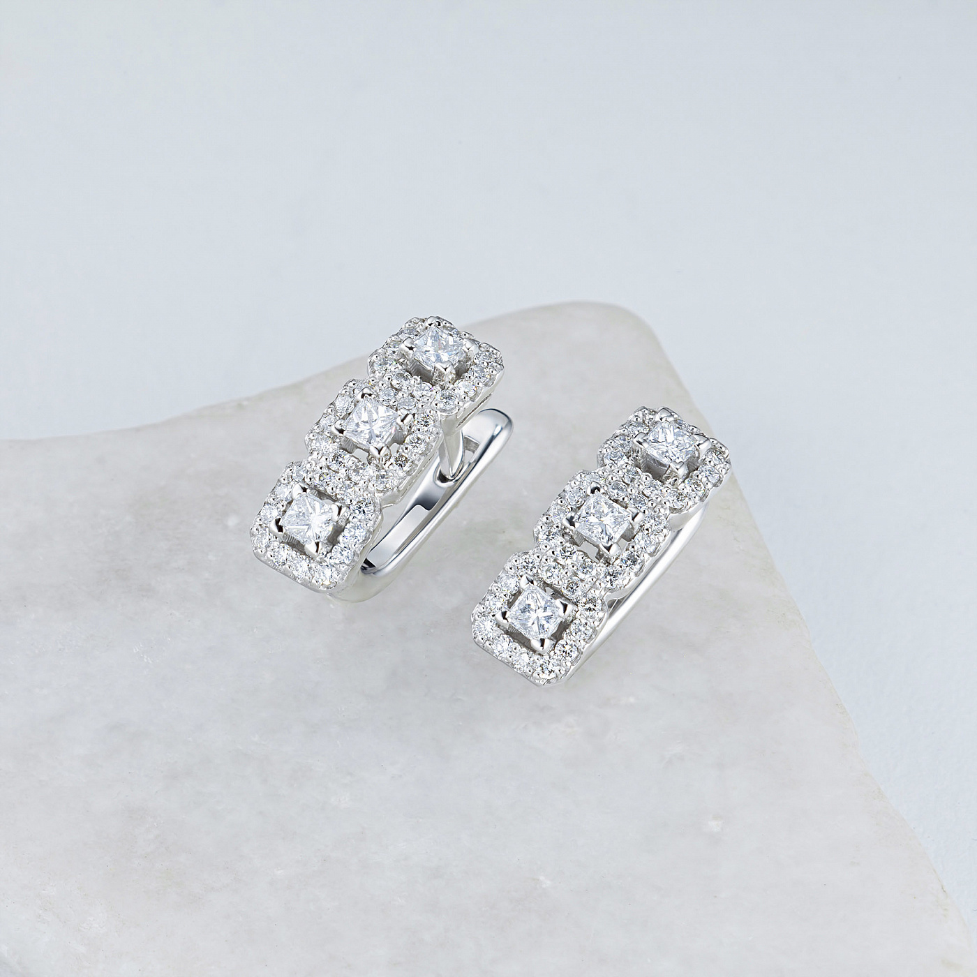 The size and shape of earrings, essentially depend on your personal preference. Stud ear-rings and concise Congo earrings are appropriate for office environment. Stylish model with "" track "" of diamonds is suitable for special occasions. Large, mas-sive earrings with pendants can be worn at a cocktail party. To choose a most appropriate piece of jewelry, please contact our consultants.
