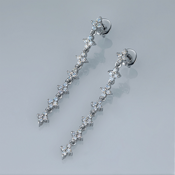 The size and shape of earrings, essentially depend on your personal preference. Stud ear-rings and concise Congo earrings are appropriate for office environment. Stylish model with "" track "" of diamonds is suitable for special occasions. Large, mas-sive earrings with pendants can be worn at a cocktail party. To choose a most appropriate piece of jewelry, please contact our consultants.